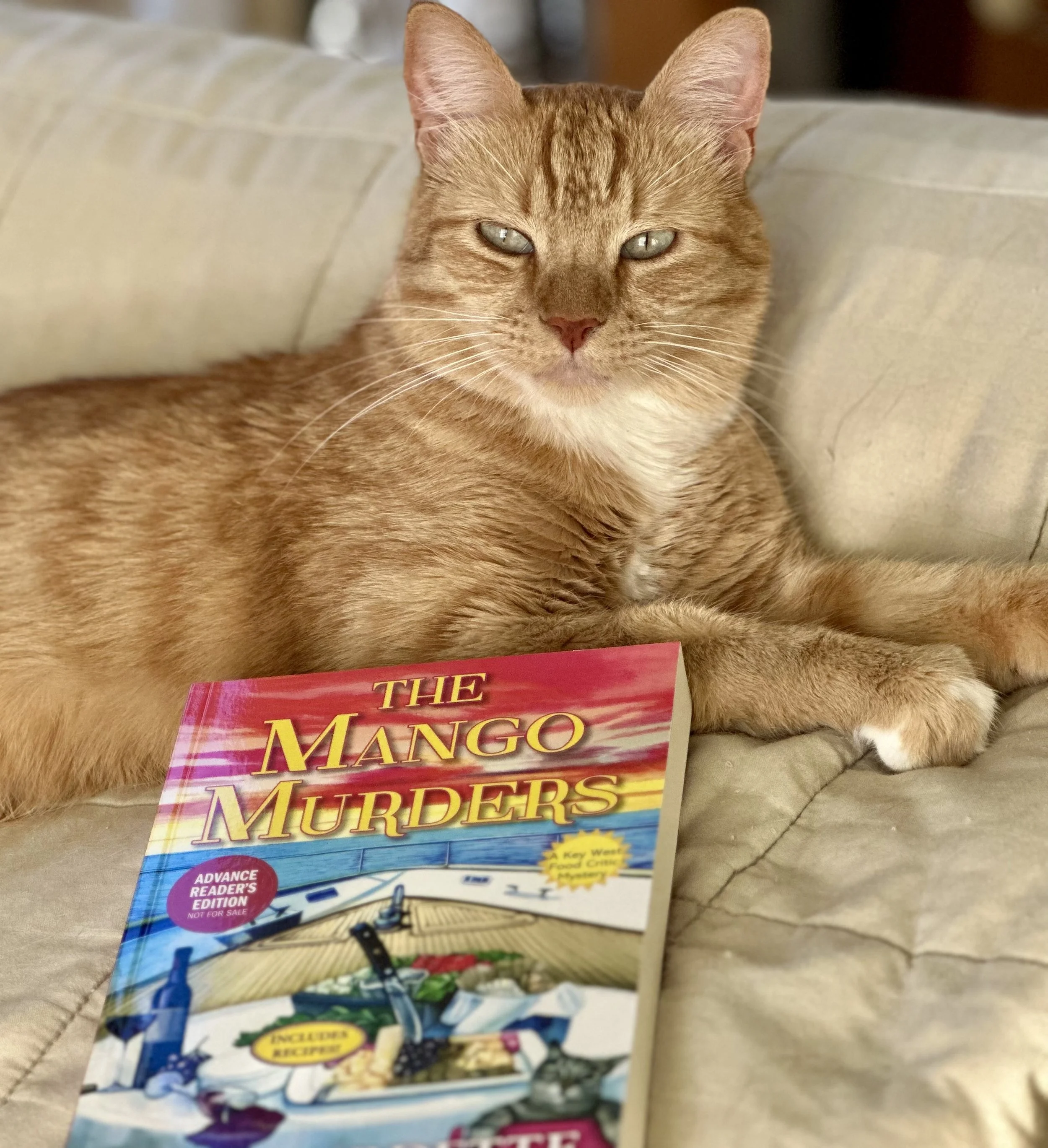 Lucy’s cat T-Bone posing with The Mango Murders (Key West Food Critic Book 15). Image credit: Lucy Burdette.