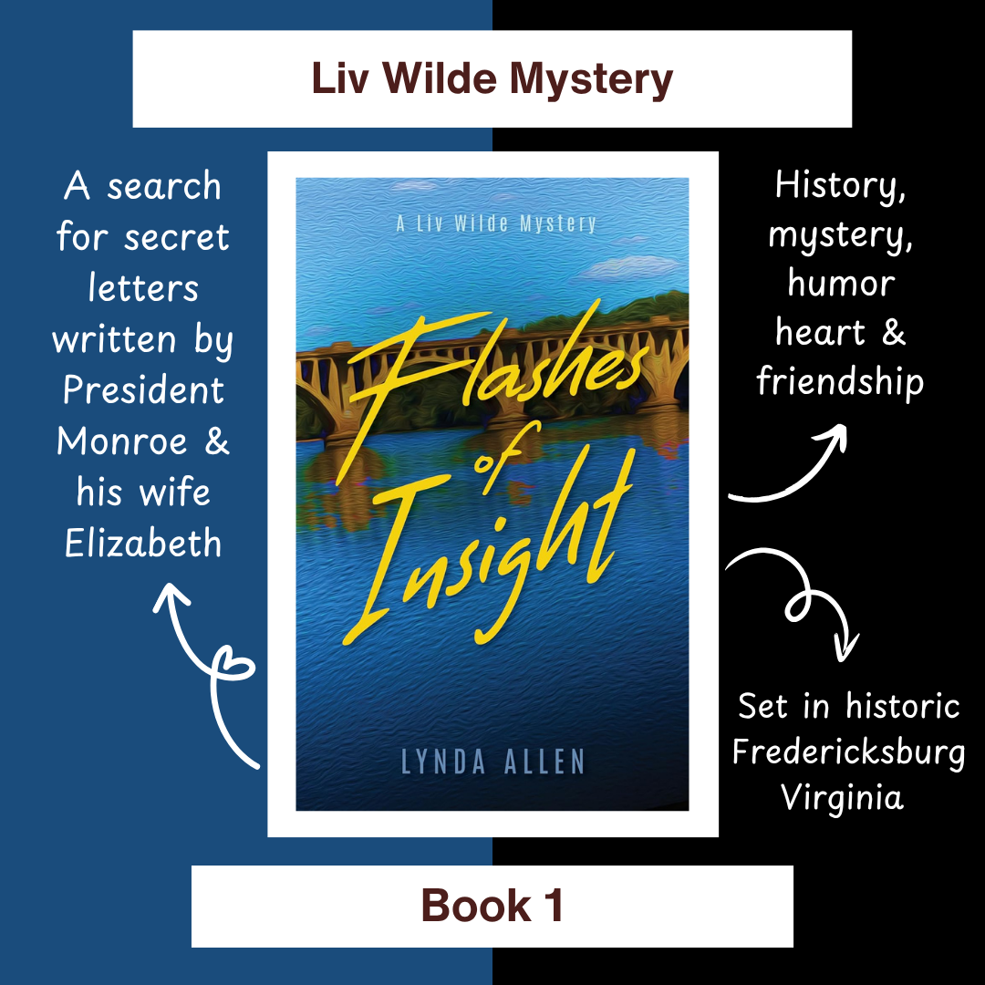 History, mystery, and menopause! Being smack in the middle of dealing with menopause-related symptoms when I started writing Flashes of Insight inspired my main character’s unique gift – psychic visions during hot flashes. I wanted her to have a circle of friends she could commiserate with about the subject and who could talk about menopause with honesty and humor in the hopes that it would spark the kind of conversations among women I wished I’d had when I started experiencing the symptoms. The history element of the first book was inspired by my time working at the James Monroe Museum in Fredericksburg, Virginia. While working there, I learned that James Monroe burned all the personal correspondence between himself and his wife Elizabeth after she died. The staff at the museum wished someone would find a secret cache of letters between the two of them that could help us better understand their relationship and home life. So, when I started writing the book, I decided to make that wish come true. I chose the mystery genre because I’ve loved reading mysteries since I was a child.